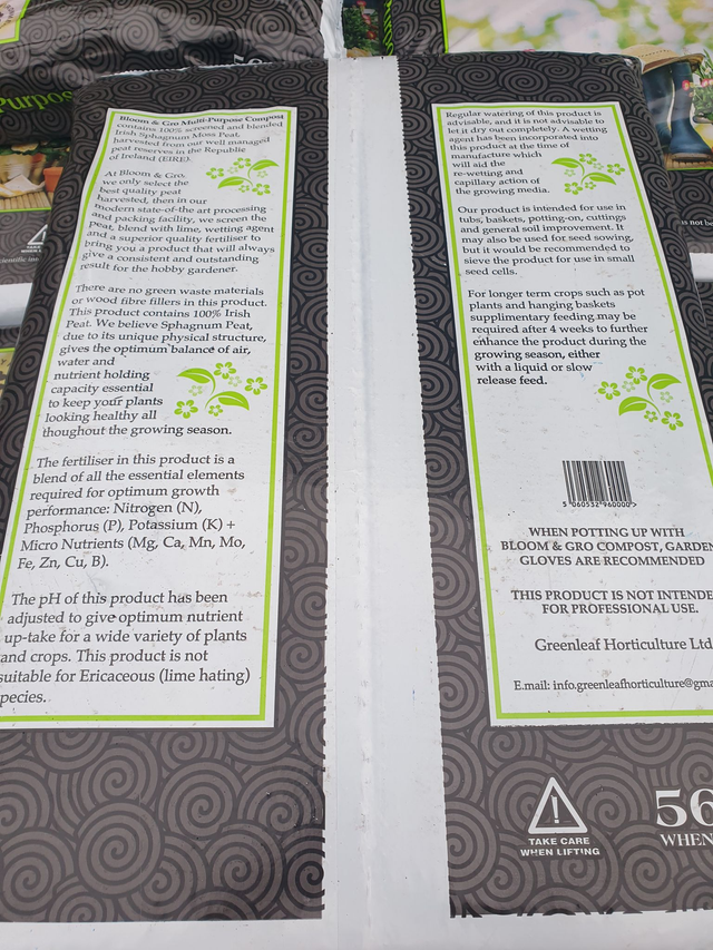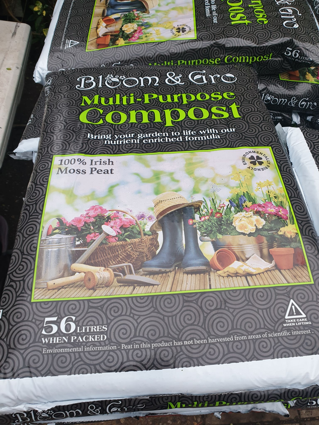 Bloom & gro multi purpose compost 56 litre bag. This compost is manufactured from 100% Irish peat, Suitable for bedding plants, pot plants, tubs and containers. Contains wetting agents and all the essential nutrients for optimum plant performance. here are no green waste materials or wood fibre fillers in this product. This product contains 100% Irish Peat. Sphagnum Peat, due to its unique physical structure, gives the optimum balance of air, water and nutrient holding capacity essential to keep your plants looking healthy all throughout the growing season.