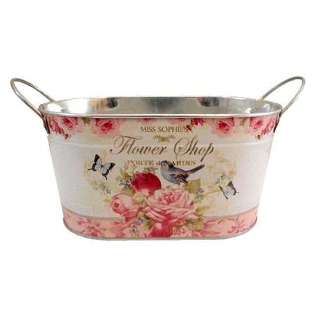 Indoor metal oval planter with handles. Lovely pink flower shop design. Perfect as a lovely gift planted out with flowers inside. Length 22cm