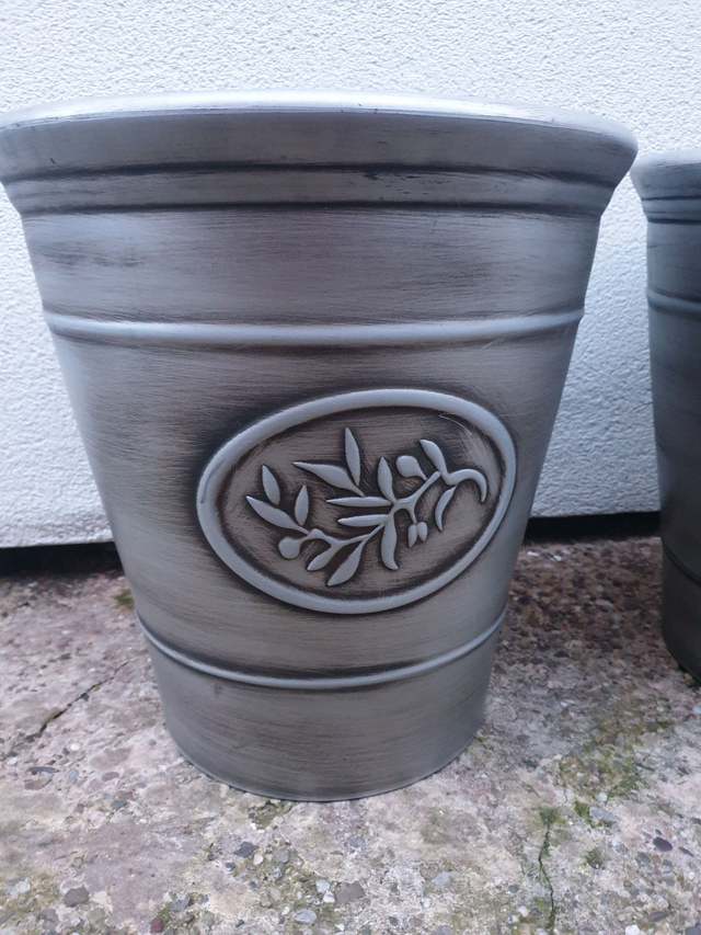 Large olive hard plastic patio planter silver. Height 40cm / Width 43cm. Plant out with lots of seasonal bedding plants at home. Please note this planter does not come with pre-drilled drainage holes at the bottom of the planter.