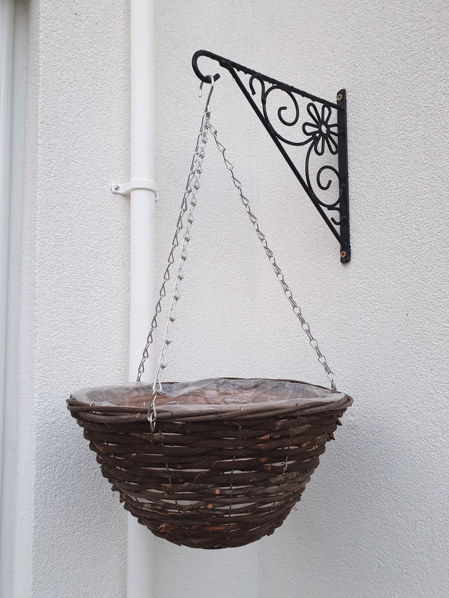 Large brown willow wicker hanging basket 16" round basket. Comes with metal chains attached. Why not plant your own hanging baskets at home. Comes with plastic liner inside basket.