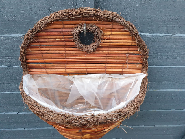 Medium brown wicker wall basket 13" wicker basket. Comes with metal hanger attached and plastic liner on inside. Why not plant your own wall baskets at home. Length 34cm