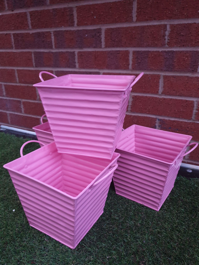 Metal ribbed tin planter comes with handles. Pink rectangle indoor planter. Square / Rectangle design. Height 15cm / Diameter: 16.5cm