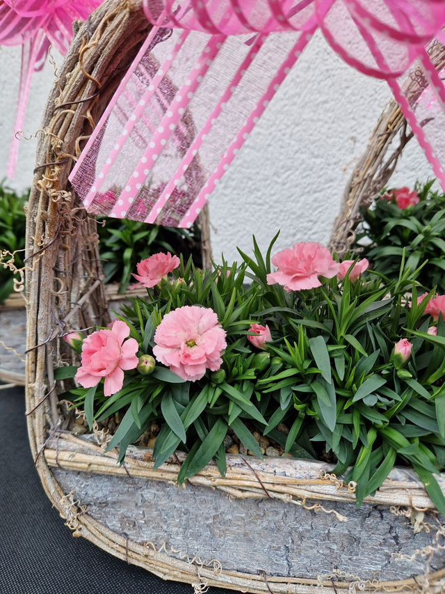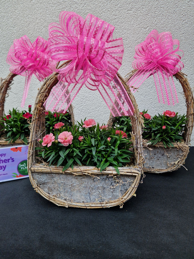 MOTHER DAY GIFT - Indoor dianthus handle planter with pink bow. One of our best sellers this lovely gift is perfect for any mum this mothers day. The dianthus flowers have a fresh fragrant smell choose from different shades of pink flowers. Sunday 30th March 2025. All mothers gifts are collection only we do not offer UK delivery on this product!