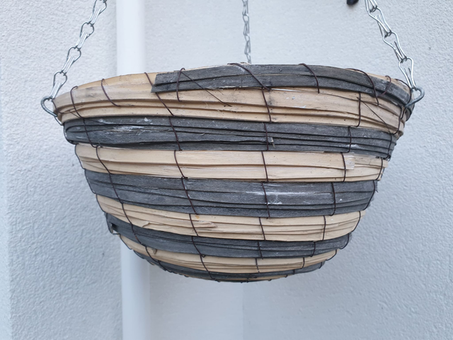 Parkland medium wicker hanging basket 14" round basket. Comes with metal chains attached. Why not plant your own hanging baskets at home. Comes with plastic liner inside basket.