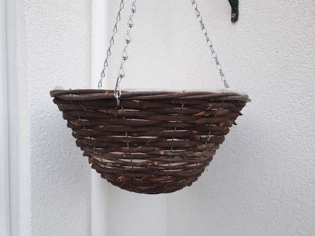 Small brown willow wicker hanging basket 12" round basket. Comes with metal chains attached. Why not plant your own hanging baskets at home. Comes with plastic liner inside basket.